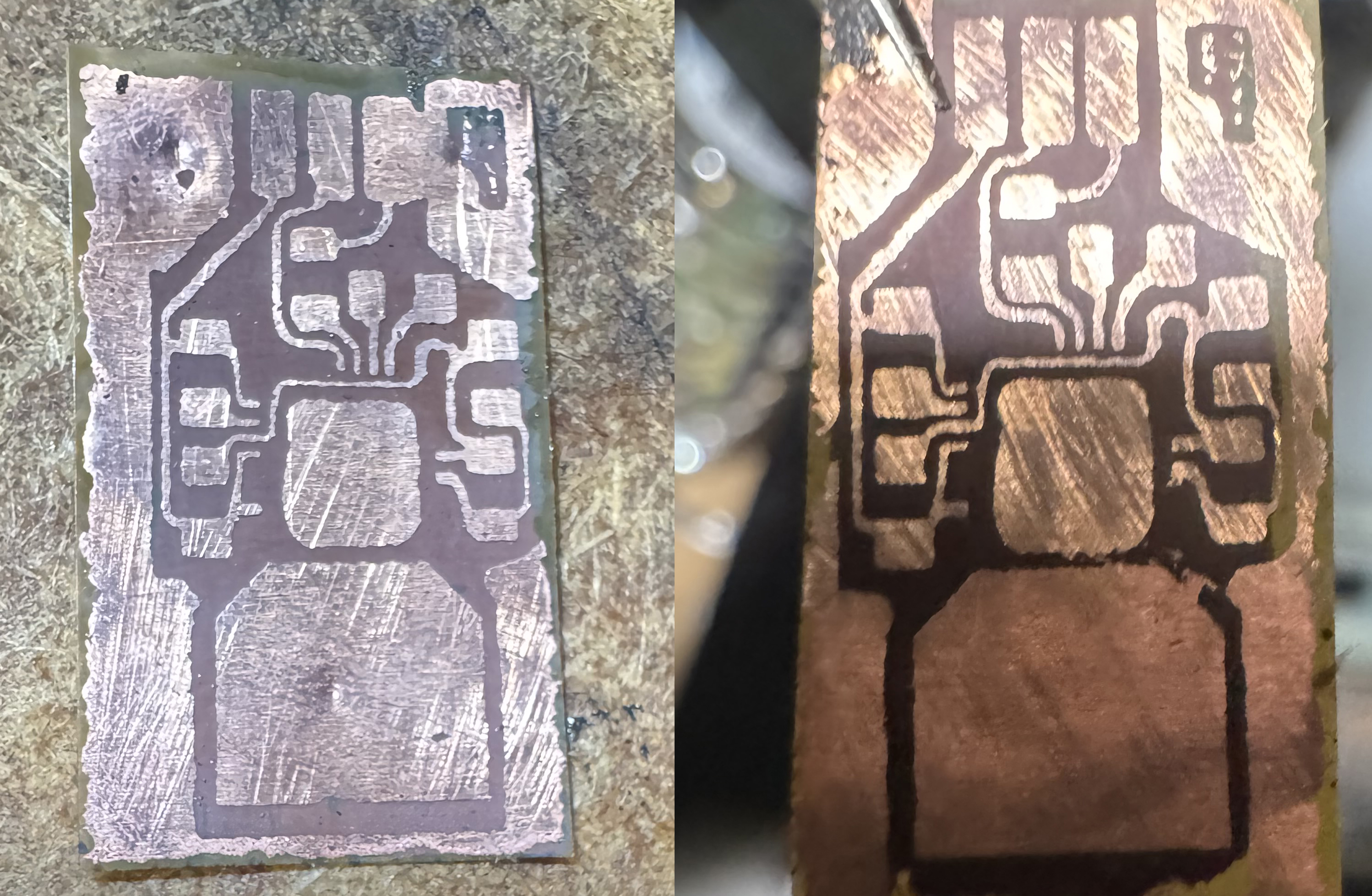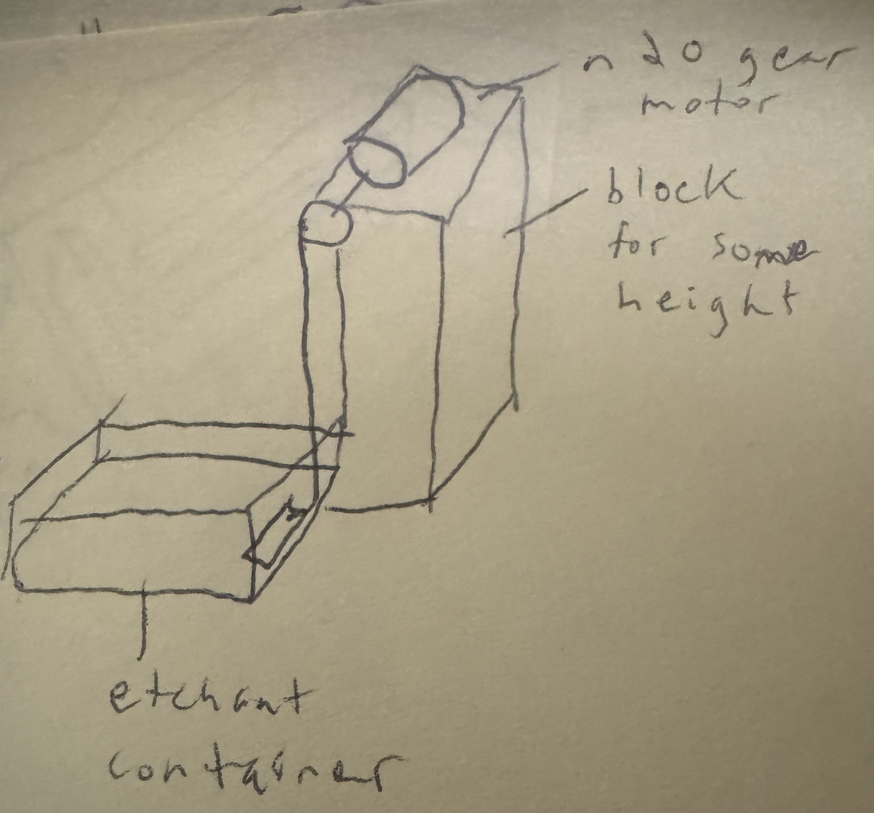 But when I went to etch this clean PCB with toner in place, things fell apart again. I used room temperature water with my Ammonium Persulfate crystal and water mixture. So it was 68F water. I did not agitate the etchant much. The etching took about 2.5-3 hours! That is horrible etching speed. The larger copper planes took their dear time to evaporate and meanwhile the finer traces had undercutting so bad that the entire copper under the toner etched away and evaporated and the toner came off having nothing to stick to anymore and whose sections were lost. The total etching time is supposed to be no more than 5-15 minutes. 3 hours is totally unacceptable. I found out from chatgpt that the reason it took forever was I failed to heat the etchant to 110-120F and I failed to agitate the mix (stir or vibrate or w/e helps). I also learned from chatgpt that for every 10F increase in temperature of the etchant, the etching time cuts in half. So a increase to 110F will mean the etching time should come down to the 5 minute range pretty likely if I also agitate well. The instructions on the container of etchant crystals said room temperature and no agitation is fine. THEY WERE WRONG for SURE on that. So to address perfecting the etching process I plan to get a AC hot plate with temperature adjust which I already own - one for like pans or kettles cooking/heating. I also determined that the easiest way to agitate would be to put the etchant and PCB in a small container and create a apparatus that lifts and lowers one side of the container in a rhythmic way so that it rocks the etchant back and forth across the PCB. Below is my simple apparatus design for that. The advantage of this approach is its free if you have the very few parts needed. I can power it with my lab power supply. The n20 gear motor is like $1. Super easy to make. Can handle my 15g of etchant sloshing easily. Simple to make. Does not have anything going INSIDE the acid which would then be spinning and crashing into the PCB and possibly causing issues there. We want just a bear minimum amount of etchant batch per PCB job and so even a spinning stir rod with magnet setup would be hitting the PCB and tossing it around violently etc I didn't want that and didn't want acid on that and having to fish it out and clean it of acid. Prefer nothing going into the acid but the PCB itself. So rocking the whole container makes sense for this and resolves that problem. The rocker apparatus consists of a n20 gearmotor ($1 on aliexpress), a little wheel (paper and superglue composite wheel), string, a little block to get the motor up higher in placement than the etchant container. As the n20 gearmotor rotates it lifts the string, raising up one end of the etchant container. As it reaches 180 degrees of rotation (6 o'clock) it has lowered the etchant container back down. It repeats this raising and lowering of the container over and over in a cyclic pattern which will cause the etchant solution to slosh back and forth over the PCB improving the rate of the chemical etching reaction and moving copper ions away from the PCB surface being etched more efficiently. No pwm motor controller is needed I don't think since you can change the rock speed by changing voltage setting on the lab power supply and/or changing radius of the wheel that is turning and doing the lifting and lowering action.
