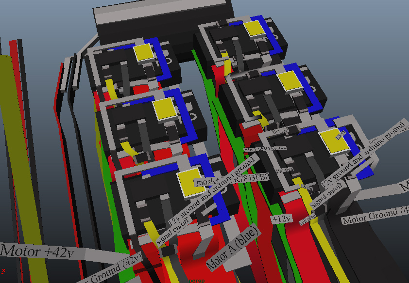 Brushless Motor Controller Schematic and Notes Above are the schematic and notes in both 2d and 3d for my custom brushless dc motor controller design. I made a 3d version to help me visualize the layout better. It is to scale with all parts modeled. I am able to follow this while constructing my prototypes. I am 95% done building a couple prototypes for the motor controller and plan to test soon. Little LEDs will light up on each power mosfet when it actuates so I can troubleshoot. Plus it will look cool. I'm planning to use a logic level mosfet to drive the main power mosfets. I've seen people do this with transistors to power the main power mosfets so I think the same principle applies to a logic level mosfet to switch on power to the main mosfets.