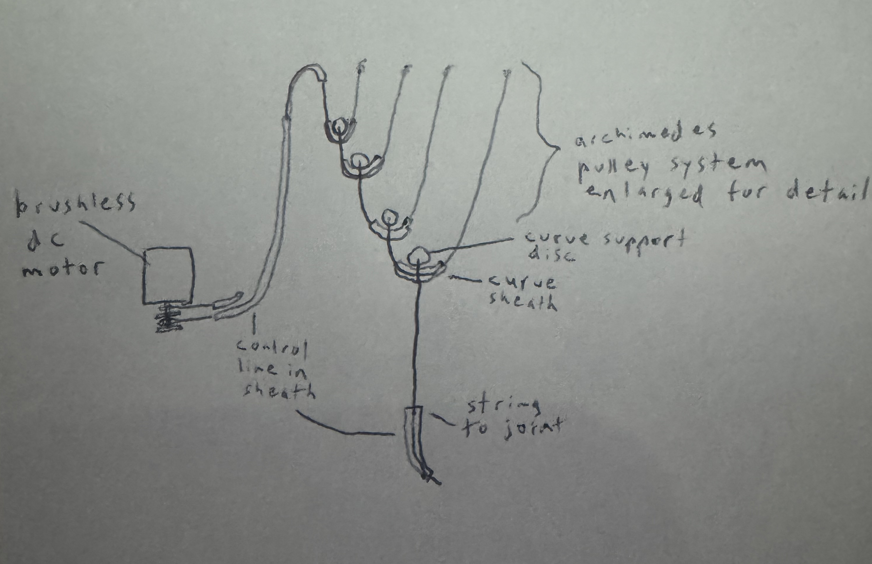 The total draw of the cable wrapping around the motor's output shaft is 24in and since it is 64:1 down-gearing, 24 / 64 = .375" is total draw at finger. This works out well I think because that is about the amount of movement I expect is needed to fully bend the index finger at these two distal joints. When we do down-gearing for other joints in the human body, more cable draw will surely be needed like 2" of draw etc for various muscle contraction distances elsewhere. So for this, to still pull off 64:1 down-gearing, we'll have to modify the complex pulley system and the total size of the system will end up being significantly larger. That will be unfortunate but unavoidable. Some of these more powerful muscles will also need bigger and stronger pulleys to handle the forces involved with the bigger motors. So size goes up there too. It's all solveable though imo. We have bigger spaces to work with for that stuff unlike the ones we are doing now which is tons and tons of pulleys in small spaces handling the intricate fingers actuations. So tiny is a must for this part with the hands but not as big of a must for other larger and less complex and intricate parts of the body. Drop a Comment: Comments: ---------------------------------------------------------------------------- Blog Post #14, submitted 6/24/24