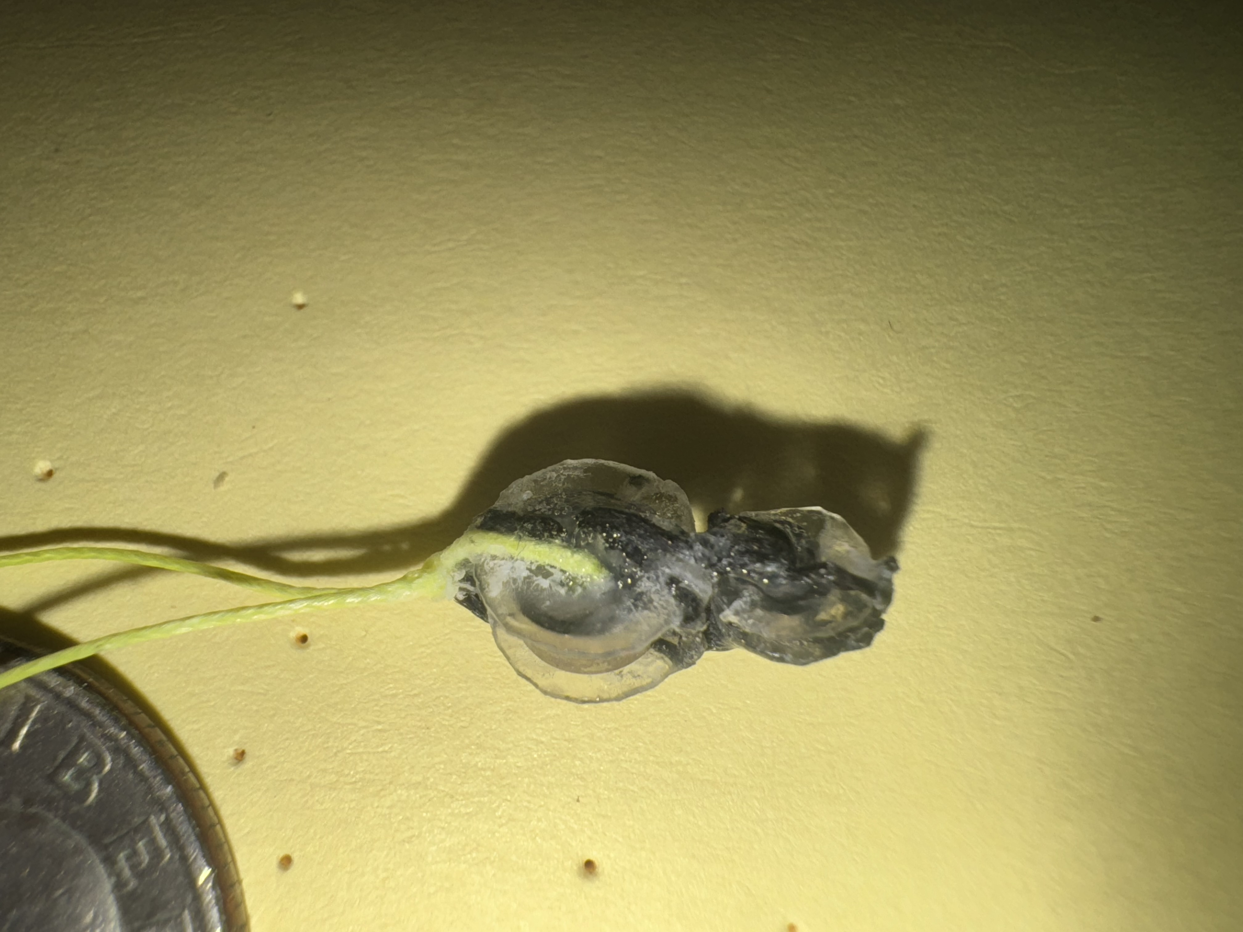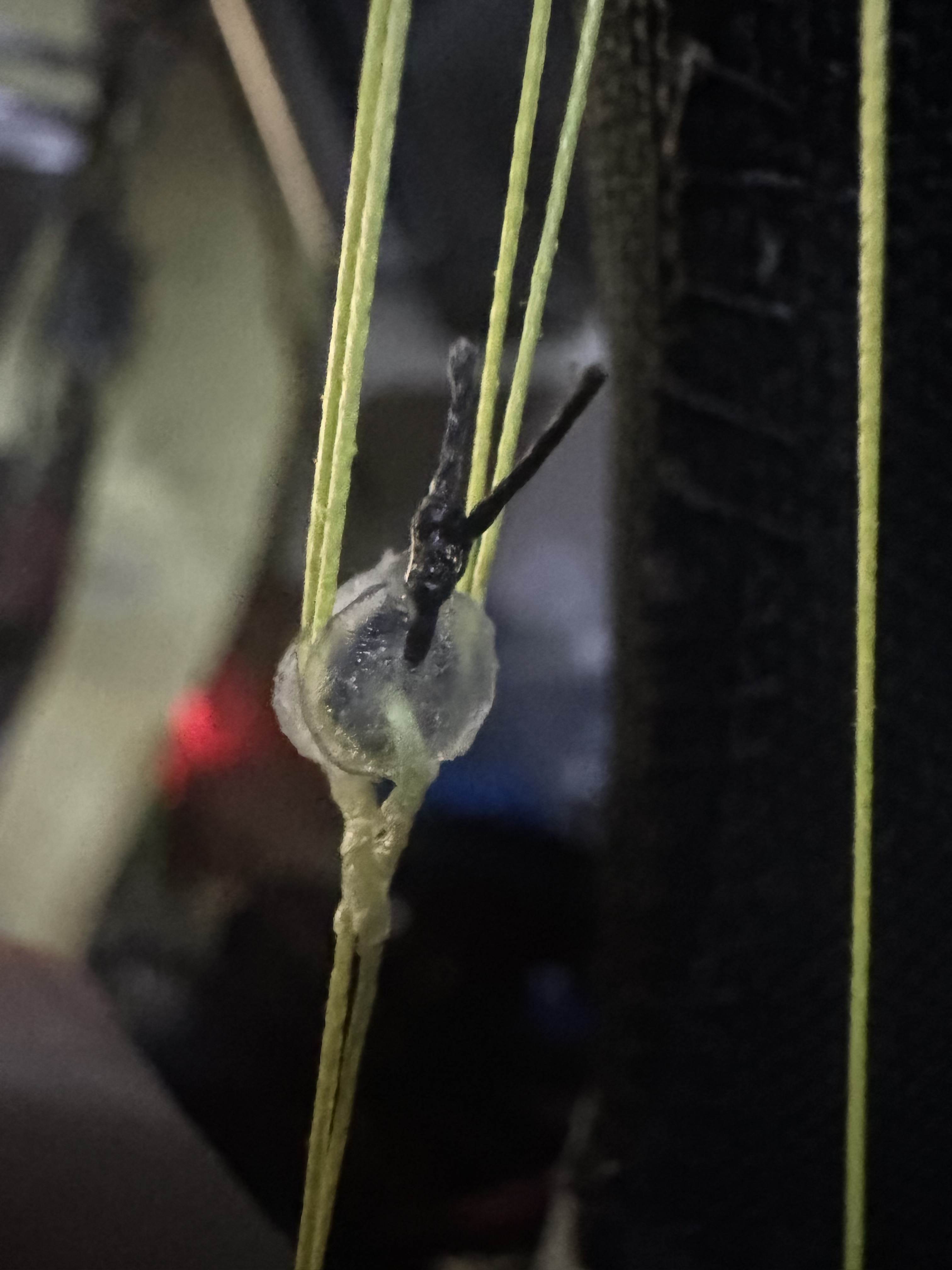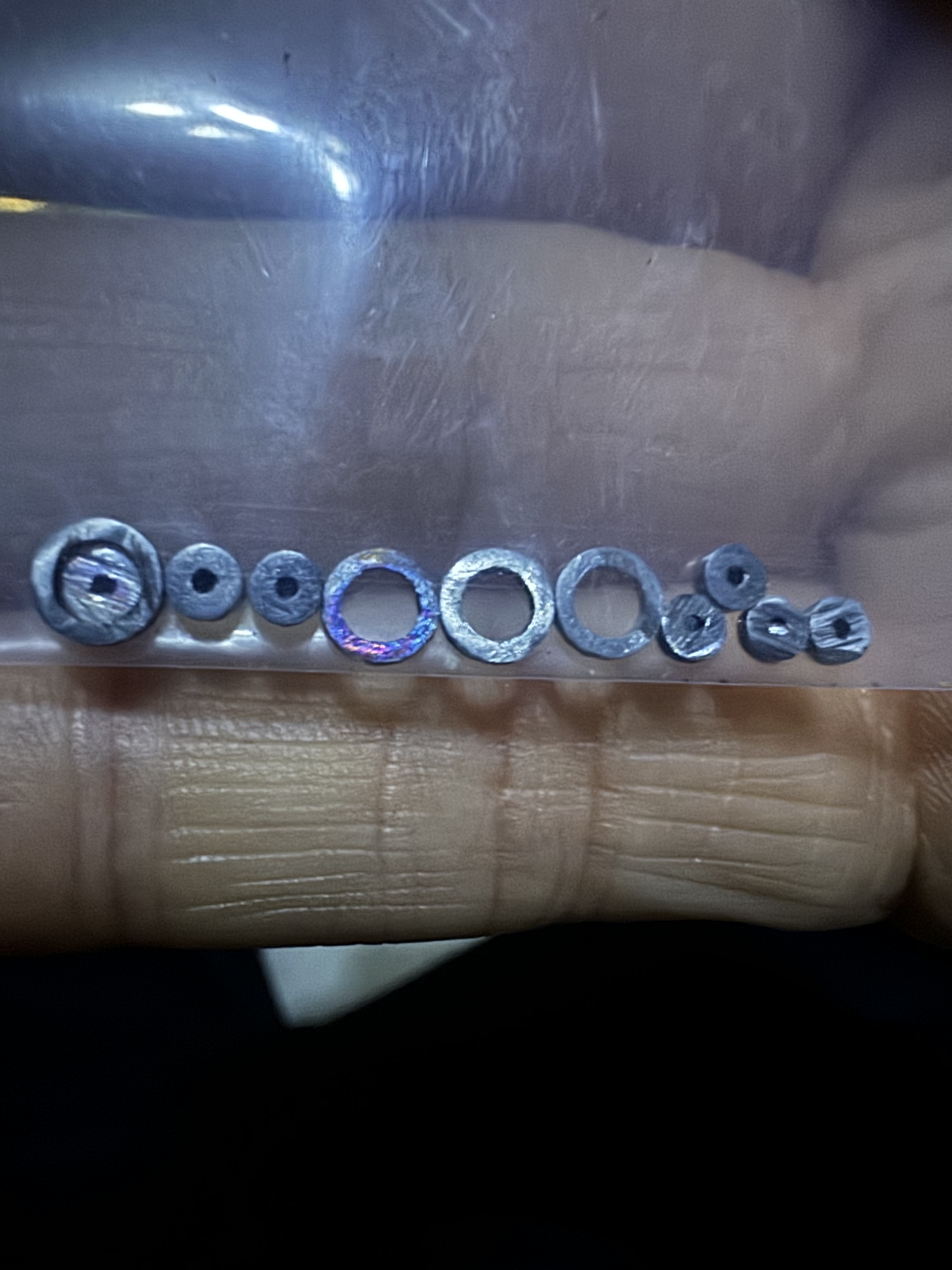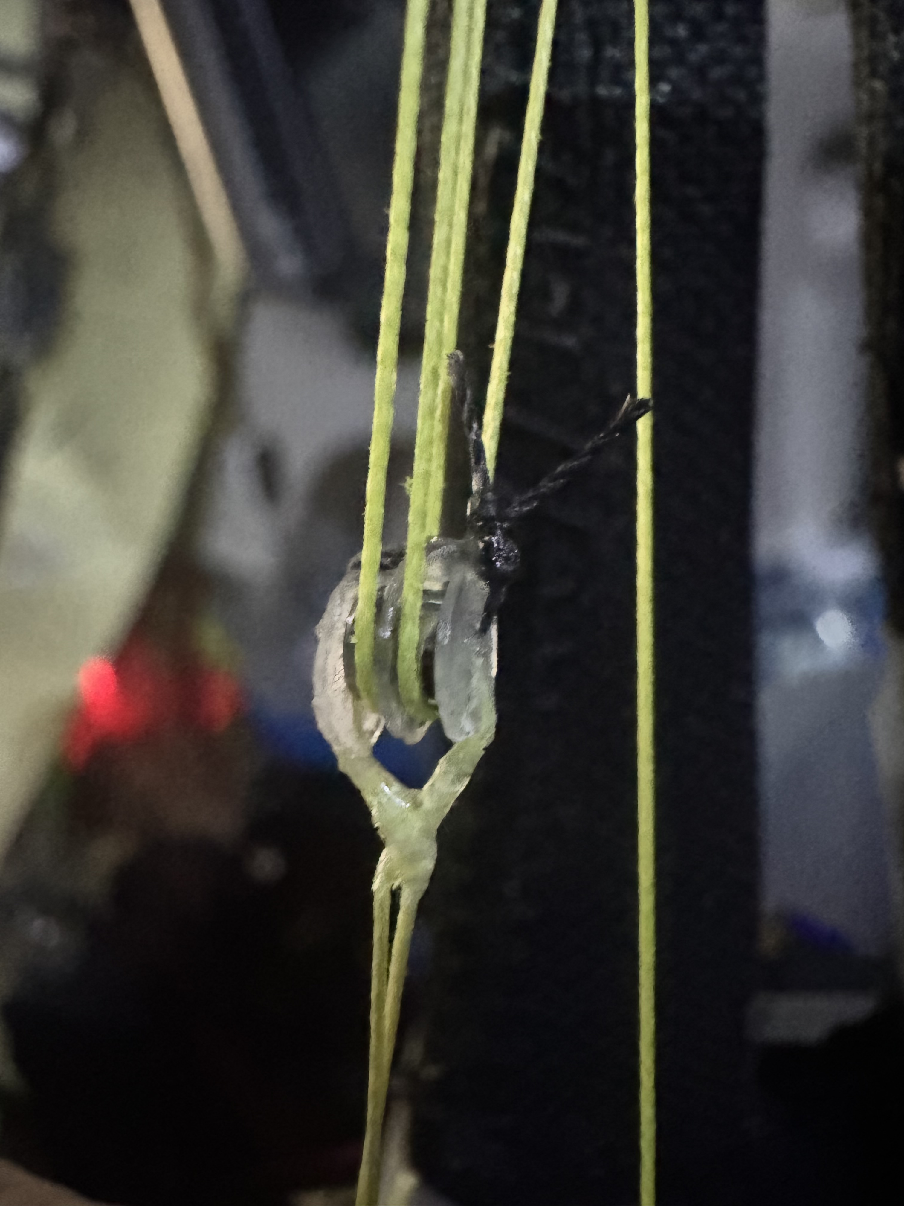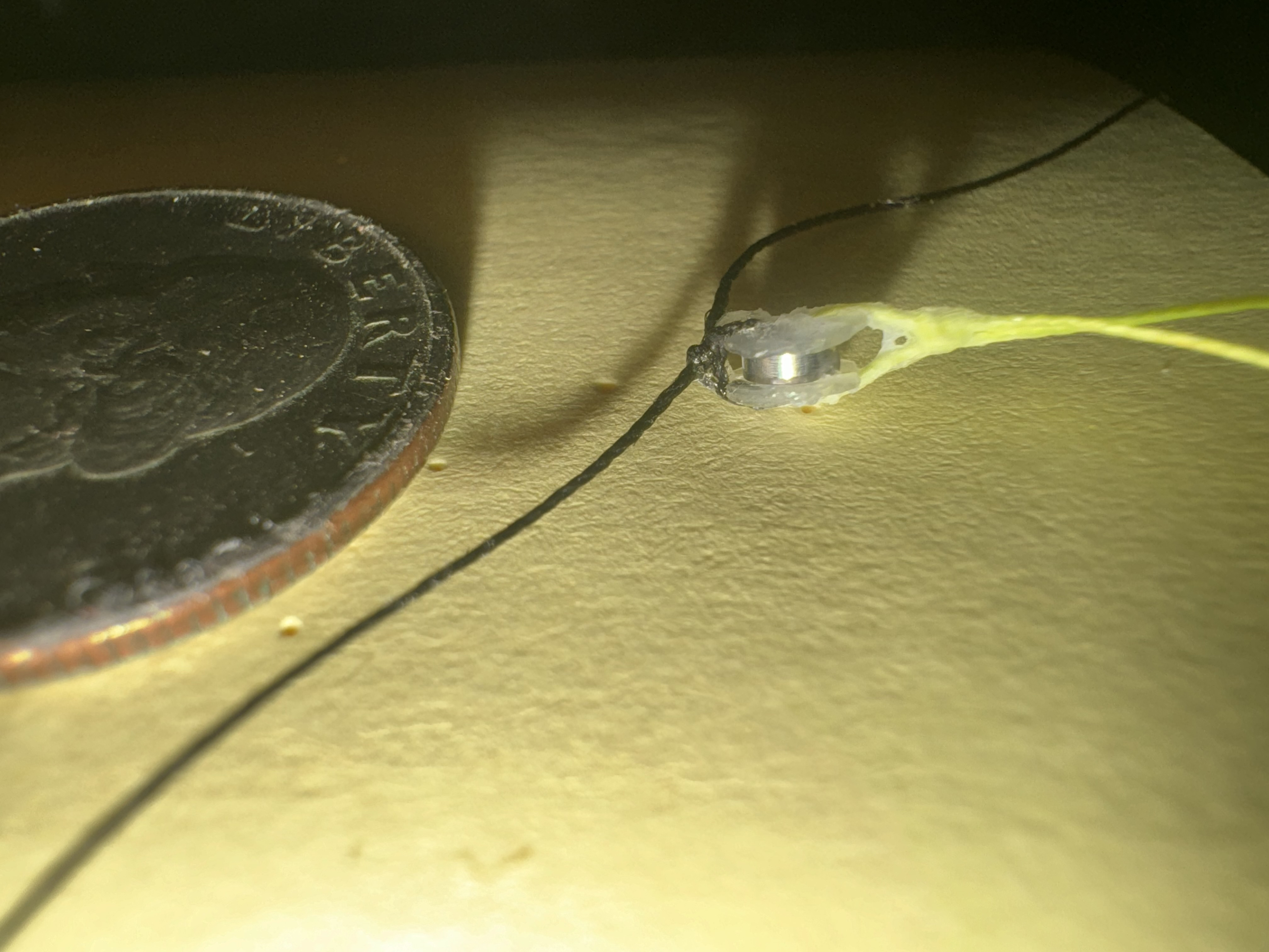Above are double stacked pulleys front and side views. One disc on either outside part and one disc in the center that splits the two bearings up. I have to add a black string across the bottom to prevent the yellow rope from skipping over the center pulley disc and hopping into the bearing next to it so that both ropes are sharing the same bearing and rubbing on eachother. That's bad. So a black string running across the bottom will make that jump impossible. So still have to add that. But overall, as long as tension is kept on this setup, it works well. I've tested it and it is working nice and smoothly. Still needs more testing but so far so good. You can see that all my knots and strings are coated in super glue. This is to prevent the knots from untying and just solidify everything more. The clear plastic discs are made from plastic cut out by hand from blueberry, strawberry, and sushi containers from the produce section of the local grocery store. Cakes also have this kind of plastic. It is firm but flexible with great memory to bounce back to prior shape if it is bent temporarily out of alignment. Pretty decent and nice and thin. I like it for this. I think it's less likely to break than a 3d printed disc. I cut it into these tiny discs just by eye with 4" straight titanium embroidery scissors. Drop a Comment: Comments: ---------------------------------------------------------------------------- Blog Post #15, submitted 6/25/24 Here are some prototype pulleys in progress of being made. I have 7 of 9 pulleys done so far for my prototype Archimedes compact pulley system design 64:1 downgearing system. The total size of the 64:1 downgearing system is 11cm x 6mm x 1cm. This is a very convenient form factor for placing lots of these in the elongated spaces of a humanoid robot where muscles would normally be located.